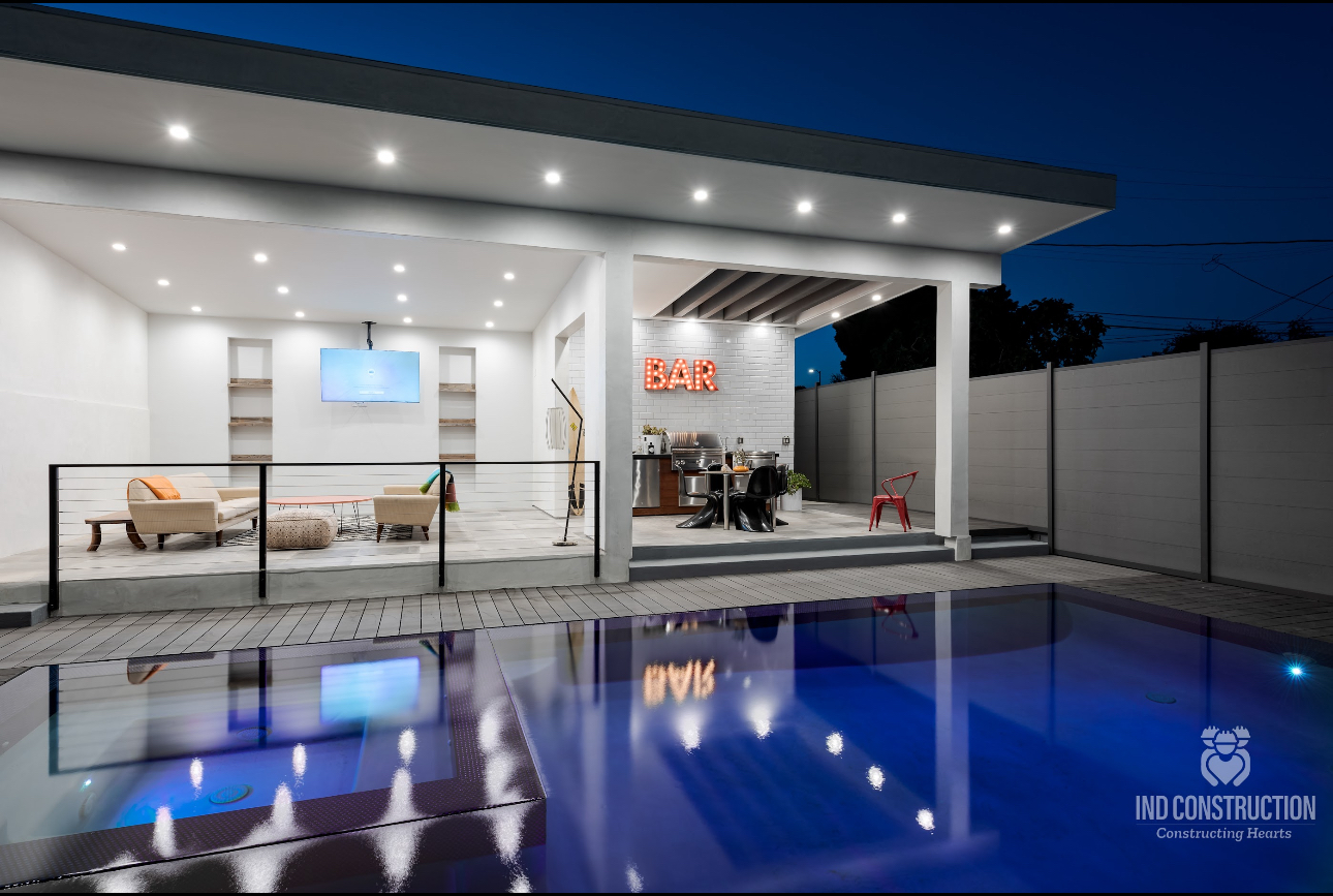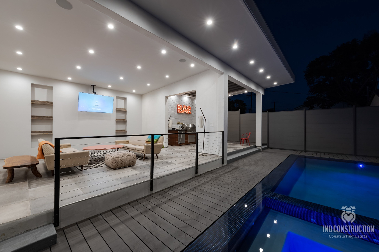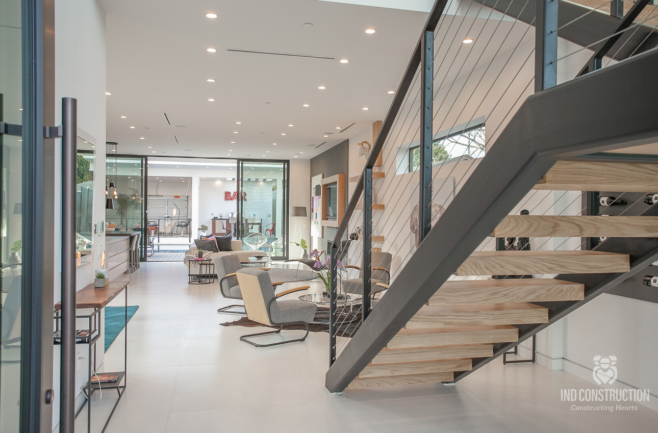 The newly remodeled area in a breathtaking expanse of open-plan living. High ceilings and recessed lighting complement the flood of natural light through large windows and glass doors, creating a bright and airy atmosphere in the living area provide comfort without compromising on style, while the adjacent dining space, with its modern table and chairs, is prefect for both intimate dinners and larger social gatherings.
