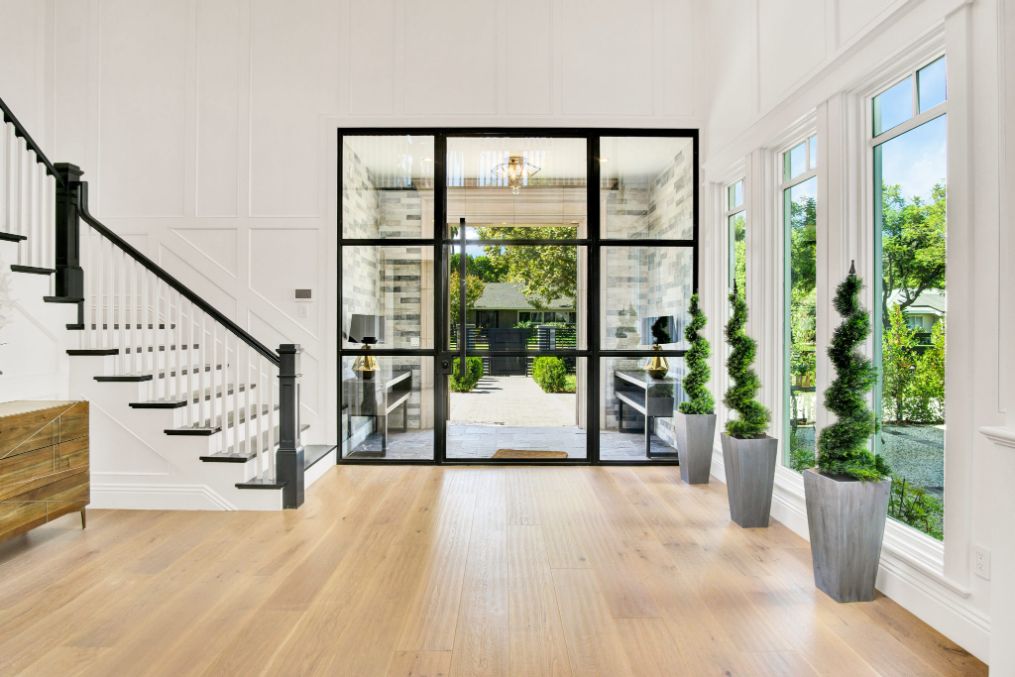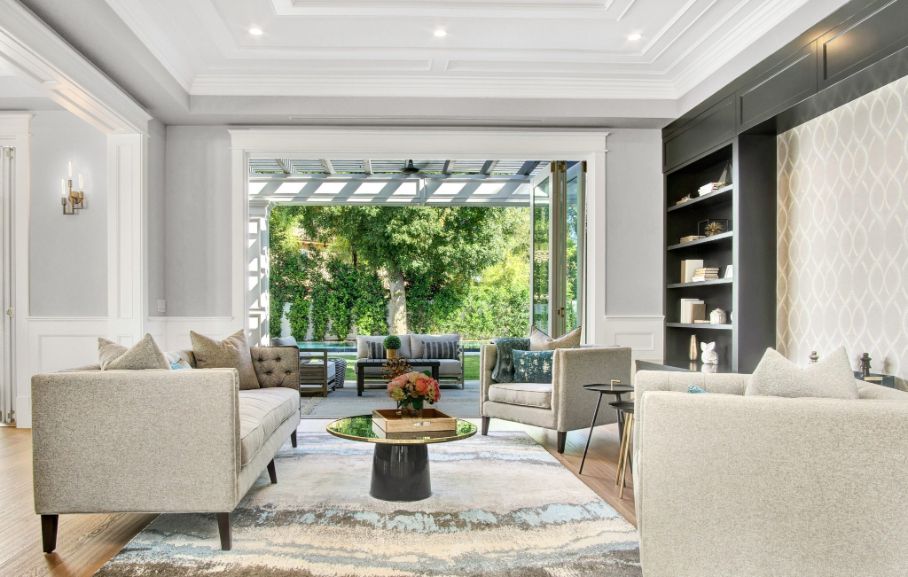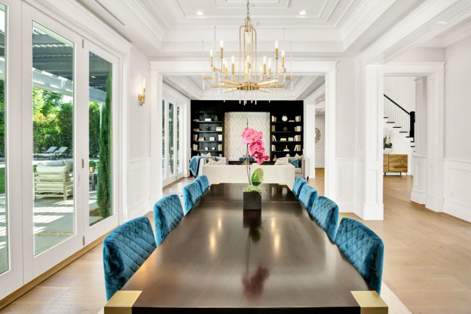 The newly remodeled area in a breathtaking expanse of open-plan living. High ceilings and recessed lighting complement the flood of natural light through large windows and glass doors, creating a bright and airy atmosphere in the living area provide comfort without compromising on style, while the adjacent dining space, with its modern table and chairs, is prefect for both intimate dinners and larger social gatherings.